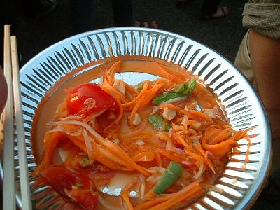 写真中は,タイじゃありえないと思うがニンジン入りのソムタム.