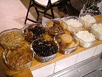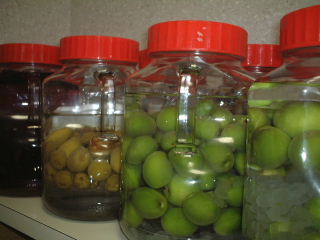 梅酒は自作に限る^^V 世田谷区野毛の豪邸に住む田中さん宅でたくさんの梅をいただいたのを契機に, 梅酒を造り始めた. 市販のと違って,甘さを押さえて造ってある. 宮治さんの話では,カストリ焼酎で漬け込んだ梅酒がうまいらしい. 今度挑戦してやろうではないか. |