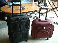 | 旅行用カート | 入院する時に購入した 直腸ガンによる入院・手術が決定的になったので, 2004年11月5日に新宿の東急ハンズで購入したスワニーのカート(A)を購入した. 価格は¥16590.写真左. クルマが4個ついているし,歩行時に杖代わりにも使えるという. 80kgの圧力に耐えられるってサ. これに入院グッズをパッキングした. スワニー社の社長は小児麻痺を克服し,エスペラントにも造詣が深い. 会社もなかなかエネルギッシュ. 同じく2度目の入院に備えて,2004年3月24日,同じスワニーのカート(B)を 中野の温故知品(カタログハウスのリサイクル店)にて購入した. (写真右のエンジ色) 業者クーリングオフ品ということでやや安かった. とはいえ¥14175.(定価は¥18900) そんなもんですか...(笑) だが手術後のヨチヨチ(ヨボヨボ)歩きの私には支えてくれるこららのカートがありがたい. |
