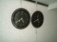 | 掛け時計 SEIKO製のスィープタイプ. | なんで同じ時計があるのかと質問される. そうだよなぁ... 見てのとおり同じ時計をふたつ用意している. 理由は止まると困るから.(笑) 2個の時計が同時に止まることはないだろう^^V 以前,NY,ロンドンの金融マーケットで稼動するシステムの開発・メンテをしていた. 現地時間が何時なのかを知るために3つの同じ時計を用意していたが, 今は目的が変わったワケ. 秒針がカチカチ動くのがイヤなので, スィープタイプ(流れるように動くタイプ)を愛用. |