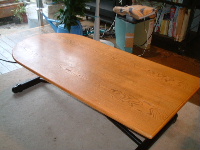 | リフティングテーブル | 同じシリーズのテーブルを3台置いてます. 購入した時はNHK社製(日本 『オスロ』というブランドだったが, 2002年ごろまでは小泉産業が引き継いで販売していた. 現在は不明. 私は同タイプの机を4個購入し,3個を自宅で使っている. 高さも自由に変えられるので,そこも気にいっている. 幅が同じ机を3つ購入したので,並べると長い机になるのもいいでしょ. それぞれ高さを変えて使っているので同じタイプとは気づかれないのだよ(笑) (A)タイプは 縦60cm×横120で角がR(半円)です.(←写真) (B)タイプは 縦60cm×横110で長方形 普段は(A)を食事用,(B)を仕事用に使う. パーティでは(A)−(B)−(A)と連結して3m50cmの長いテーブルにしちゃう. |