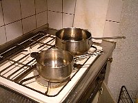 | 鍋 | 主に使う鍋はイタリア・ラゴスティーナの美しい(美しかった)鍋がふたつだけ. 1978年ごろ購入しているので付き合いは長い. この鍋は傑作だ. フォルムが美しい. フタに湯気を通す穴がない. だが,鍋フタのスキマからうまく水蒸気が抜けていく. 炒め物をして,肉や野菜がクルッと回転してこぼれないのがまたすごい. |