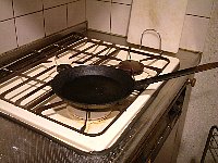 | フライパン | 重くて頑丈なフライパン 金沢八景と金沢文庫の間にあるサニーマートの金物屋さんで購入したフライパンを 30年以上使っている. 購入したのがたぶん1975年. 使いやすいので2005年4月時点で30周年を迎えたヨ. 特に目玉焼きがおいしく出来る. 私は水を注がず作る固めの目玉焼きが好きだなんだ^^;; |