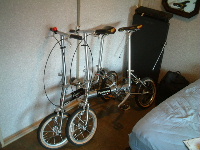 私の愛用のチャリ. たぶん1999年ごろ,宮○通信工業の宮○さんを通して2台購入した. チタン製なので重さは6kg. 本川越や逗子・鎌倉・江ノ島をサイクリングする. |