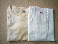 | 下着(Tシャツ) | 愛用者が多いBVDの下着 高校生の時からBVDの丸首を愛用.(U首じゃダメなんだ^^;;) もう30年近く経つよ(笑) 粉石けんで洗いつづけていると黄ばんでくる. 見かけがキチャニャイけどね. 中年オヤジに愛用者が多い気がするヨ^^;; |