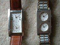 軽井沢でジェフ・ベックのコンサートを観に行った時に購入した思い出の一品. 腕時計(A)は主に仕事用.メーカーはセーコー. 筐体の薄さに強く惹かれて,1986年に購入. 時計のムーブメントが2個ついた腕時計(B)と(C)も仕事用. (B)は1995年ごろ購入. (C)は2003年ごろ韓国で買ってもらった^^;; 遊びでは,大き目の腕時計(D)と(E) 両方ともスオッチ. |