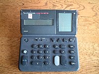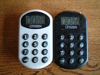 | 電卓(B)と電卓(C) | 検算や再計算に重宝する電卓 TI製でペーパーレスという名前がついている. これは計算過程が液晶に記録されて,途中で計算数字の再入力が可能. 持ち歩きのために小型の(C)も併せて購入したが, 8桁のみなのが欠点. いまでは12桁仕様もあるらしいので機会があれば欲しい. |