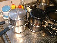 | フライ用の鍋 | 2つ重ねて片方が保存・片方を調理に使う. カタログハウスで2000年ごろ購入したと記憶する.(A 写真右) 便利だが野菜などを揚げるときに小さいなぁと思ってた. 2005年3月に後継器をみたら大きさが大きくなっているし, 格段に材質がよくなっている. なので衝動買いしてしまった...(B 写真左) 古い鍋(A)は肉用,新しい鍋(B)は野菜用として使うことにした. (A)の油汚れはこびりついて取れません. フライ用だから仕方がないじゃんかと開きなおる^^;; |