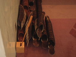 福島県のある温泉旅館で無造作に重ねられたスリッパ.