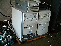 ついでだからまな板(こげ跡もあるよ)にクルマを取り付け,2台のPCの台車にしちゃったよ^^;;;; BR> そんな時間あったら他に優先順位がたかいものがあるだろうと時間管理の本にも書いてある(笑)